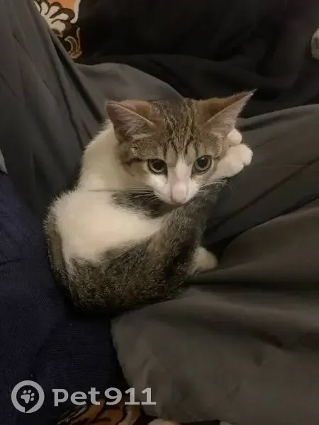 Бело-серый окрас, зелёные глаза, очень маленькая, ласковая, вылезла через окно, под сеткой, вознагрождение!!!