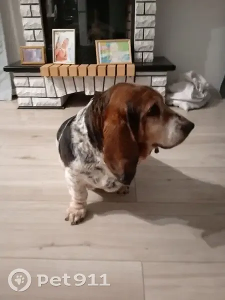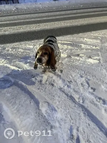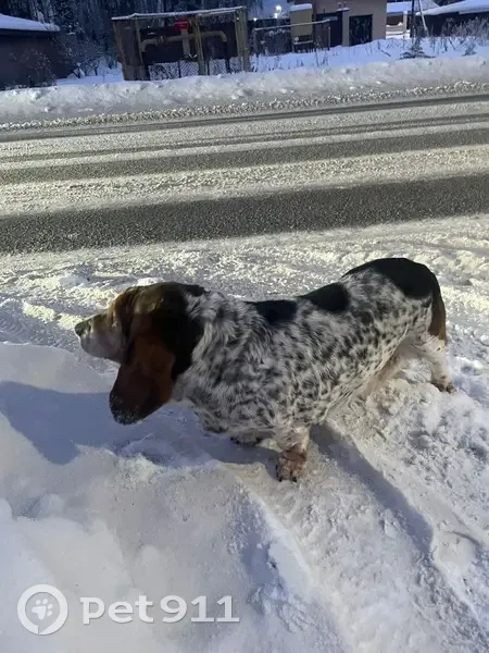 Бассет. Девочка. Контактная. Состояние шерсти хорошее. Перекормлена. Аппетит хороший. Выглядит здоровой. Ходила по проезжей части ул.Лесная, пос.Прохладный, Белоярский район, Свердловская область. Собака не шла к ближайшим домам, а упорно стояла на проезжей части. Ошейника нет.