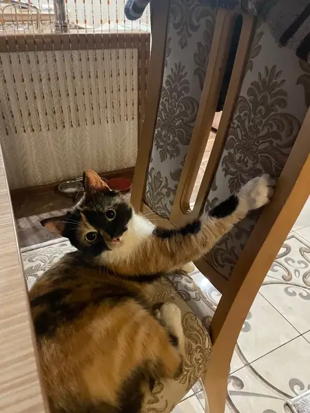 Кошечка молодая,ласковая,только родила,потому что молочная грудь,котят не нашла в коробке,только ее. Подкинули к подъезду. Кушает корм сырой,лоток поставила,но за ночь она никуда не сходила,спала с нами в кровати. Забрала временно,потому что сама беременная.