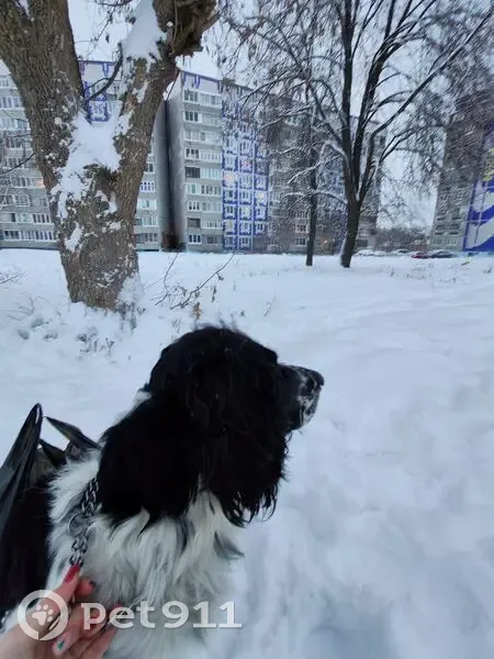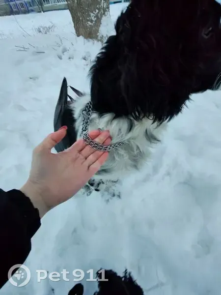 Спаниель, чëрно-белый, глаза карие, хвост купированый. Как ошейник идëт цепь в два ряда. Средний, на вид молодой. Девушка гуляла с собакой и он к ней прибился. Она искала хозяина,но безуспешно