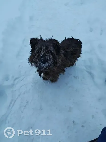 Лохматая, тёмный цвет шерсти,мальньго роста,в ошейнике.