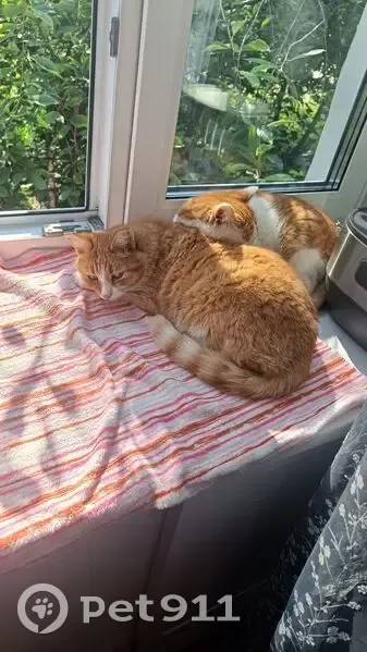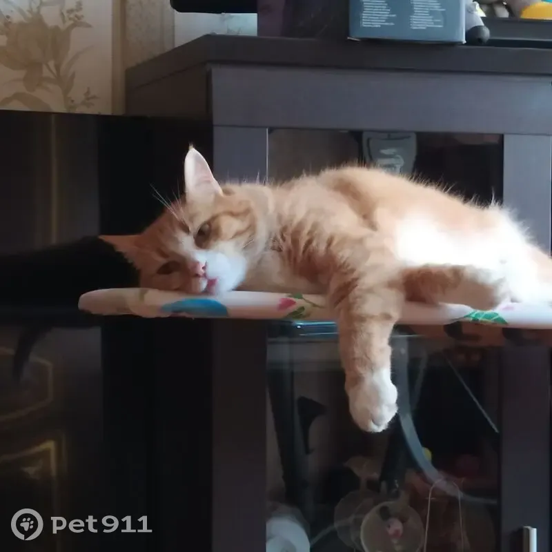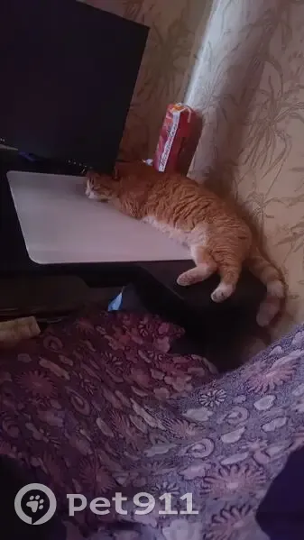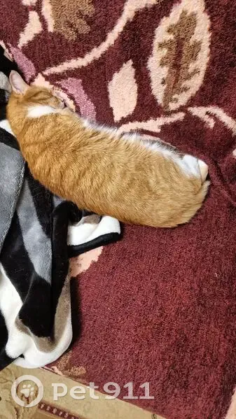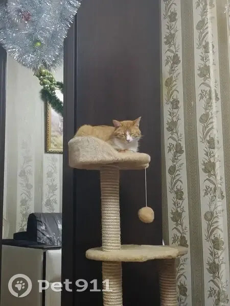 Рыжий, хвост в полоску ближе к концу хвоста,мордочка немного белая в части носа, живот белый, на вид крупный мальчик, ласковый, отзывается на имя рыжик.