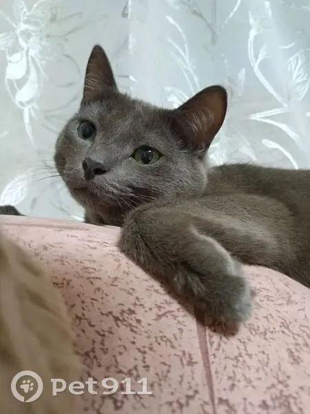 Серый , кастрированный кот , на левой брови небольшой шрамик, на правой передней лапке 2 белых пальчика и одна розовая подушечка остальные темные.