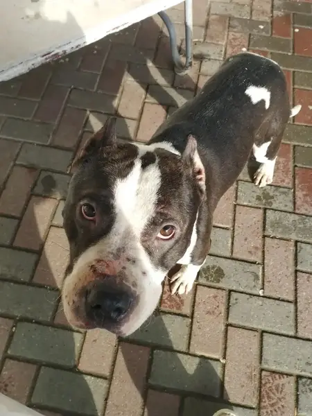 Породу не знаю но похож на помесь буля, больше среднего размера, шерсть жесткая, на морде короткая, на спине кудрявиться. Худой, потерялся давно. На нижних веках папиломы. Идет к человеку если ласково говорить, если сказать строго нельзя - уходит. Глаза карие. Ныряет под руку, плачет скулит, ищет дом, устал. На местных собак не лает, не агрессивный.