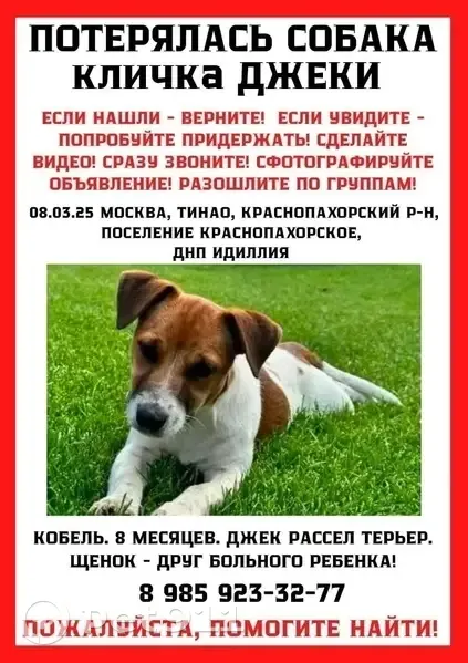 Джек Рассел 8 месяцев , без чипа, без ошейника убежала 8 марта в районе ДНП Идиллия . Нашедших просим позвонить по тел 89859233277за вознаграждение. Очень прошу кто нашел попридержать нашу собачку видели в Троицке на ул Текстильщиков д8 , но поиски там оказались безуспешны. Пожалуйста отзовитесь кто нашел эту собаку тк эта собака больного ребенка за вознаграждение