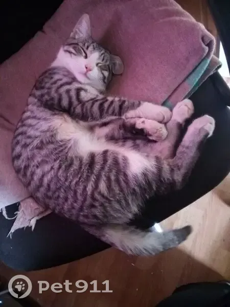 Котик Тёма,7 месяцев,серый в полоску,гладко шерстный,пузико белое,хвост очень длинный,глаза медовые жёлтые,пухленький,на лапках белые тапочки,не конфликтный.