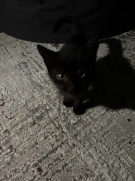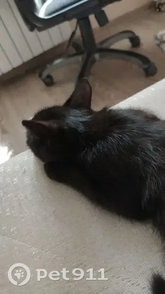 Черный окрас ,по описанию определения возраста ей месяца 2-3. Очень игривая и ласковая. Когда оставляют одну может мяукать. Девочка , была найдена у магнита