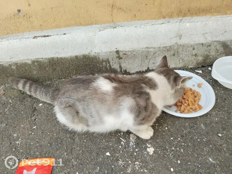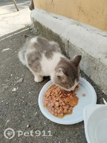 Кот, не кастрированный, бело-серый окрас с зелено/жёлтыми глазами. Не крупный, на вид молоденький. Бежит к людям, не боится, видно что домашний. Хозяин отзовись.