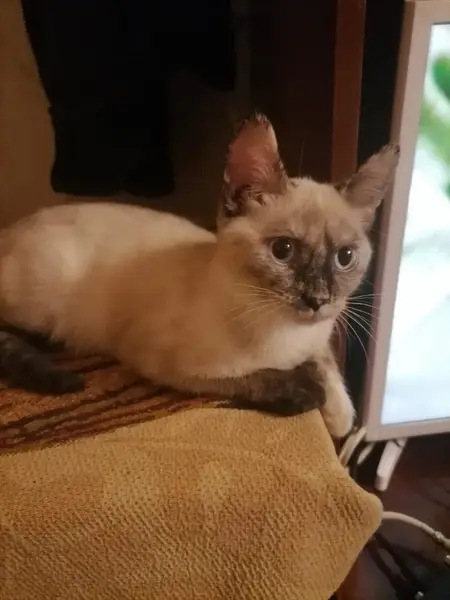 Тайская кошечка, возможно потерялась! К сожалению фото не очень, делали в темноте. Очень красивая кошка, с голубыми глазами, окрас по породе, бежево-песочный, хвос полосатый. Ищем старых или новых хозяев. Обработана от паразитов, обитает возле Магнит-Косметик на ул. Буденного, 147, между улицами Октябрьская и Кирова. Готовы подготовить к передаче (груминг и т. П.). Тел. +79184964960 Приложено фото из Интернета, кошка точно такая же, только одно ушко неровное, видимо было травмировано