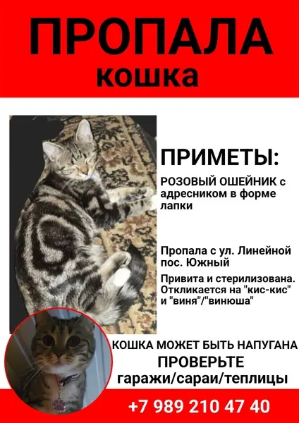 Давно найдена, но не перестаём искать старых или новых хозяев Плюше. Кошке около 5 лет по словам ветеринара. Порода- шотландская. Окрас-мрамор на серебре. Стерилизована. Вес около 6кг. Добрая, ласковая, горшок знает, но не любит других животных. Не подружилась с нашей старой кошкой, поэтому сейчас у друзей на передержке.