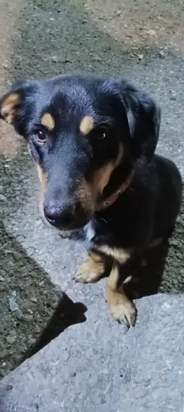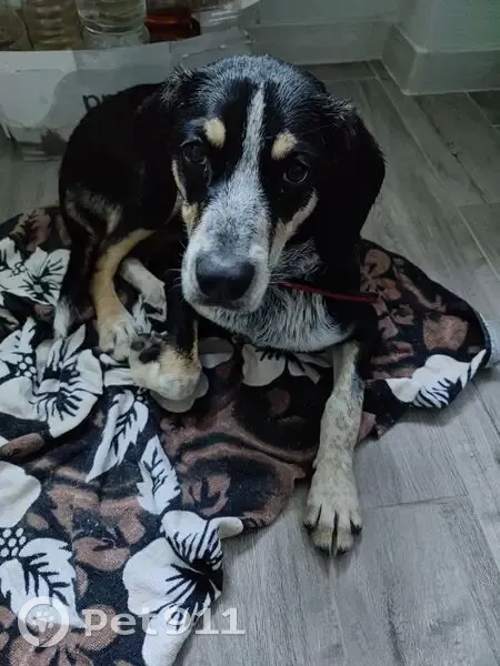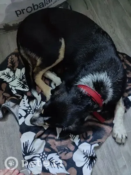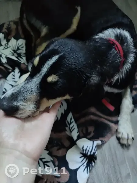 Молодая девочка, очень дружелюбная, породу не знаю' короткая шерсть, черный окрас с белым подпалом, белые лапы и нос, вислоухая. На собаке был надет красный ошейник.