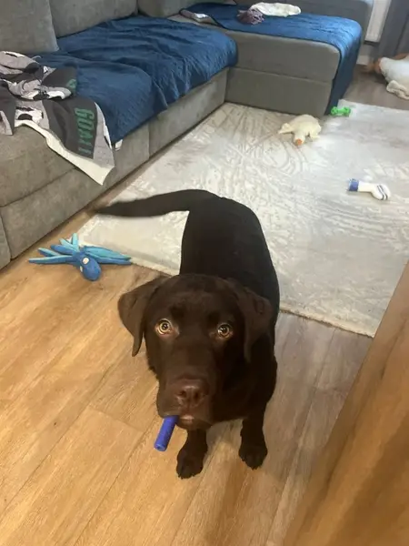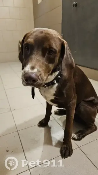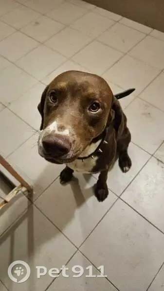 Найден кабель в районе дома N103 по ул. Лукьяненко, с виду ухоженный, но грязный после дождя, породу затрудняюсь определить, подсказывают знакомые что курцхаар. Размер средний, примерно как у лабрадора. Контактный. На нем черный ошейник с шипами. Белая грудка и на шее тоже белый участок.