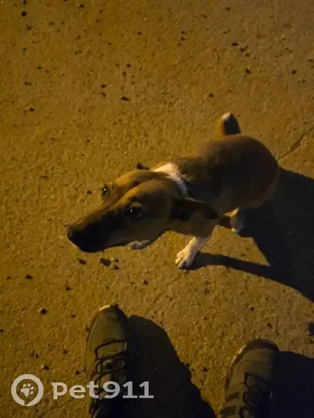 Коричневый с белым. Похожа на джек-рассел-терьер. С ошейником (синий капроновый), но явно в стрессе и потерянности. Мгновенно привязалась. Умная, держится рядом.