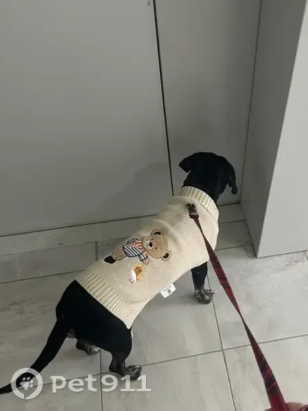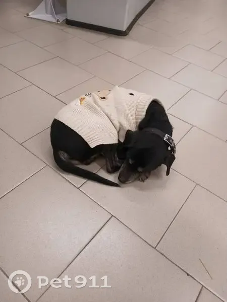 Пёс в возрасте, был в приметном свитере, черный окрас с серыми пятнами на пузе, лапах и на мордочке у носа, приличный, воспитанный, видно, что домашний.