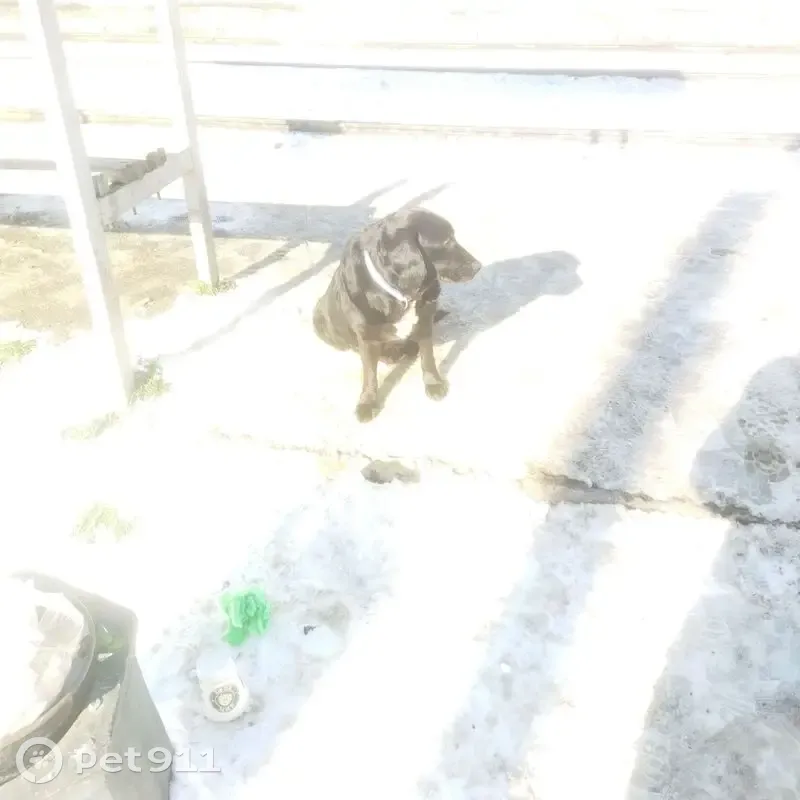Чёрная со свисающими ушками, Блек говорит, что она породистая. Сидит на остановке Крупская трамвая, потерялась наверно , есть ошейник тряпичный синтетике, и замок пластиковый бежевый.