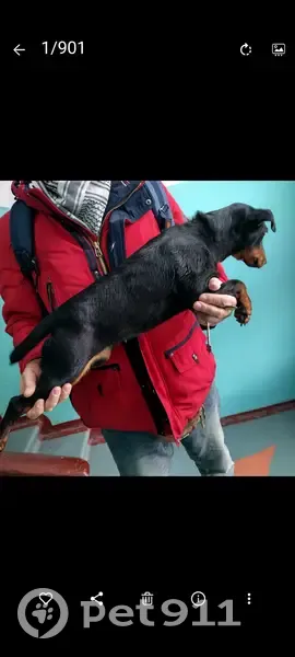 Черная с рыжим. Похожа на ягдтерьера. Девочка. Очень подвижная. Доброжелательная. Ласковая. Подобрали без ошейника. Днём ранее видели как металась в поисках хозяина ещё в ошейнике