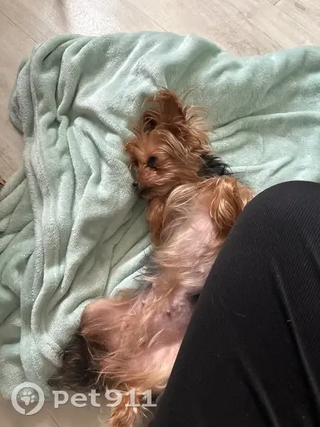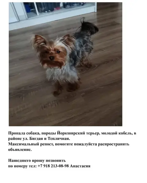 Окрас: черно-раже-белая На голове был хвостик с голубой резиночкой, ошейника не было Собака прибивалась к прохожим, прыгала на ноги и подвывала Она достаточно умная, приучена к пеленкам и прогулкам Очень ручная