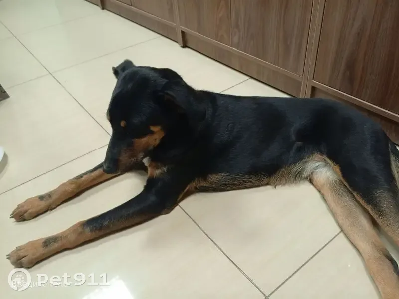 Собачка молодая, среднего размера, окрас черный, лапы палевые, по шее и грудке идет белая полоса. Видно что домашняя, ухоженная не истощена,очень спокойная, на еду не кинулась. Как долго тут находится не знаю, нашли 2.02.26в первой половине дня.