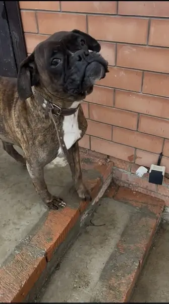 Стаффорд. Коричневый с белой грудью. Мальчик, спокойный, привыкший к поводку, дома ведёт себя великолепно. Любит диван.