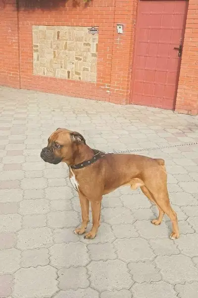 Кобель немецкого боксёра, с ошейник. Очень грязный, прибивается к людям, не агрессивный. Явно потерялся. Пытались передержать у себя , но открыл калитку и убежал.