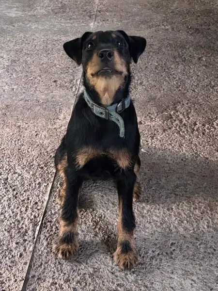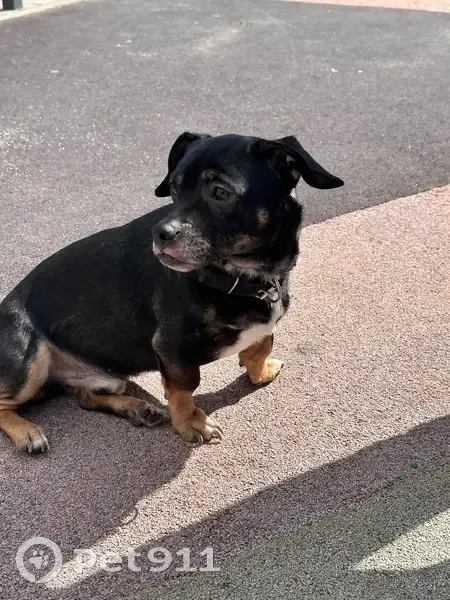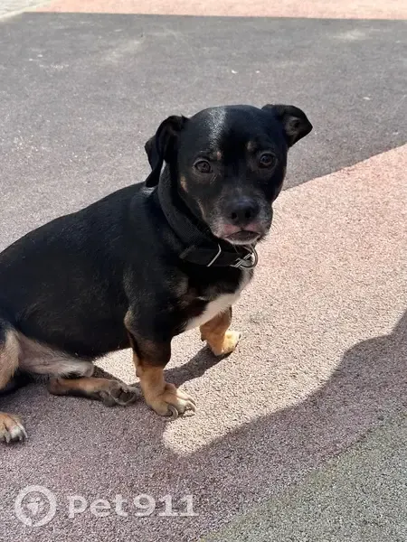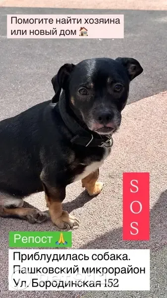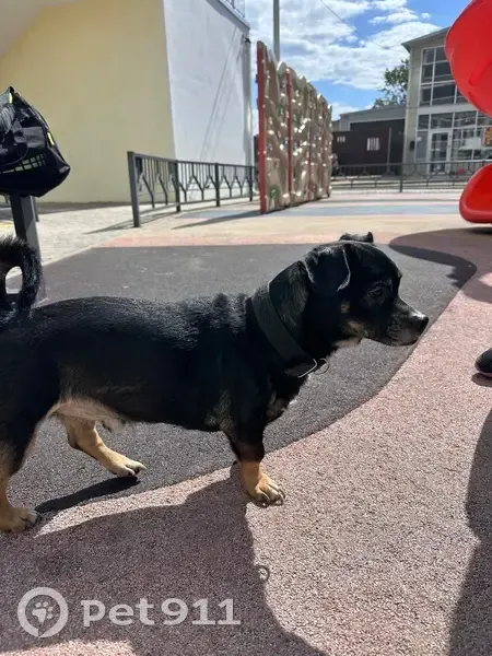 Черного цвета, на шее черный широкий ошейник. Утром нашли на детской площадке. Собака мечется и всех обнюхивает. Не похожа на бездомных собак. Идет рядом, знает команду сидеть и лежать.