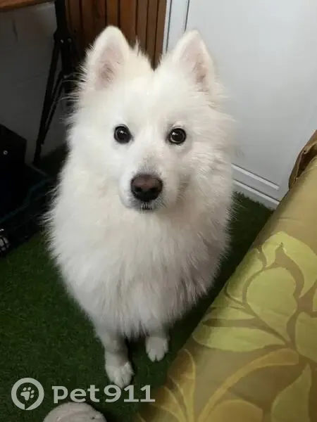 Найдена собака, белая шерсть, на морде чёрное...