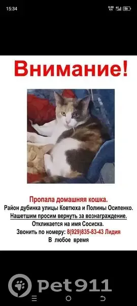 Кошка трех цветная цвета не яркие, тусклый окрас Домашняя частный двор выходила гулять ушла на улицу и не вернулась Возле носа есть пятно кажется как будто грязное но это родимое