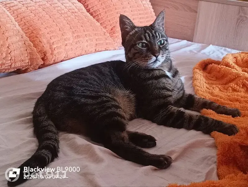 Со спины серый с черными полосами как у тигра. С живота преимущественно рыжий в пятнах. Ему 16 лет, но в хорошей форме. Глаза зеленые. Кот крупный, два верхних клыка немного обломаны, это с детства. Улицу не знает. Не агрессивный. Проглядела, выбежал из дома. Надеюсь, что кто нибудь его подберет и свяжется со мной, 89628551571. Заберу сразу. Буду очень признательна. Кастрирован, имеет чип.