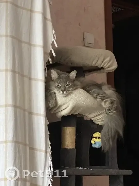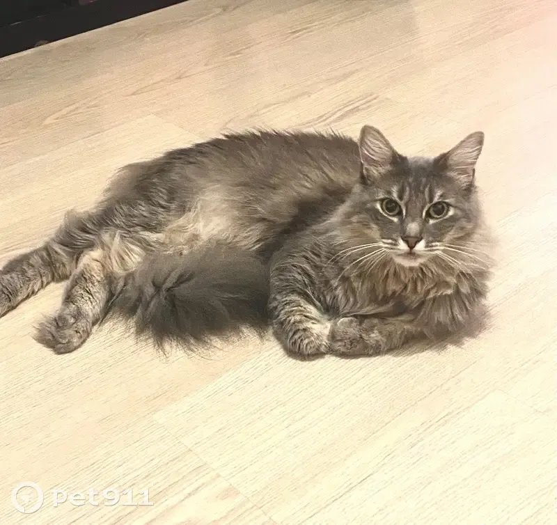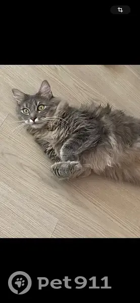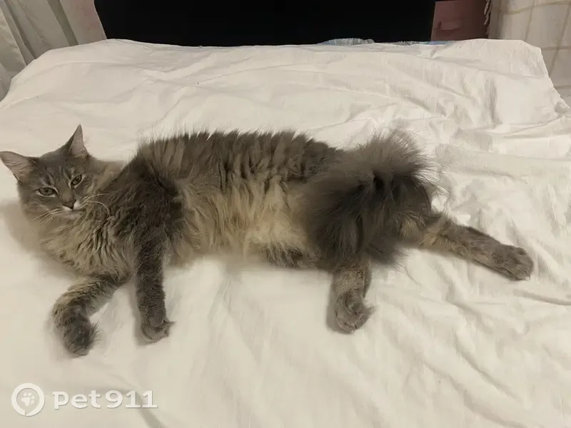 Выбежал из квартиры. Серый, пушистый, большой с длинным хвостом. Напуган, пару раз лишь был на улице. Выбежал 21.12 в 18:00