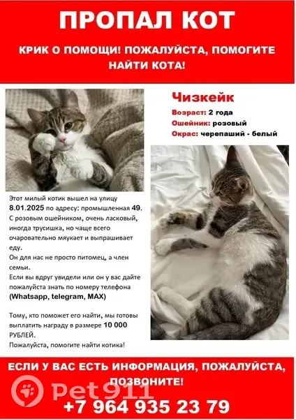 Каждый час поисковый робот Pet911 на основе искусственного интеллекта сканирует и распознаёт тысячи фото со всех тематических сайтов и социальных сетей для того, чтобы найти питомцев, похожих на вашего.
