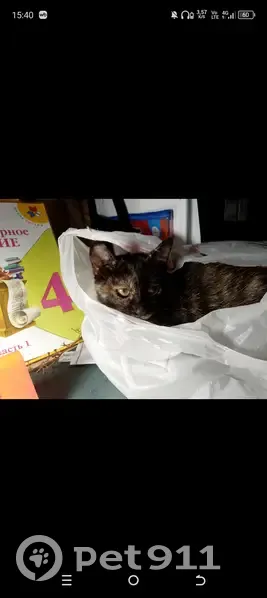 Беспородная кошка, трёхцветная,пятнистая, цвета: чёрный,рыжий, белый. Кончик хвоста белый,сам хвост чёрный в рыжую полоску. На момент пропажи были жёлтые глаза,пушистая. Остораняеться незнакомцев и убегает от них.