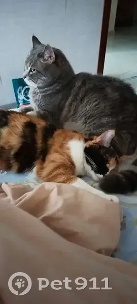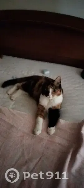 трехцветный, ласковая 7-8 месяцев, 28 февралч была стерилизациия, несла на укол после операции 1 марта, решила нести в руках, она чего-то испугалась и ускользнула измрук возле дома, очень ласковая-ласковпя, любит мячик из шерсти другого кота, спала только возле голоы моей, ходила кругом за мной, просто все 24 часа