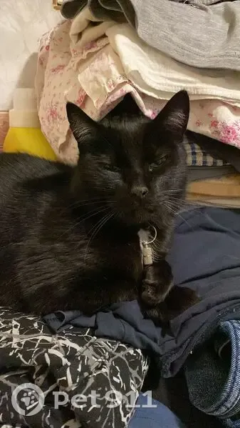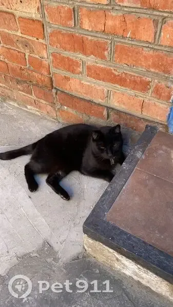 Кот.Окрас черный. Ласковый., кастрированный, белое пятно на грудке, был в ошейнике с адресником (металлическим цилиндром там в нутри бумажка с номером телефона) глаза зеленые. Хвост поломанный, задние ноги колесом.