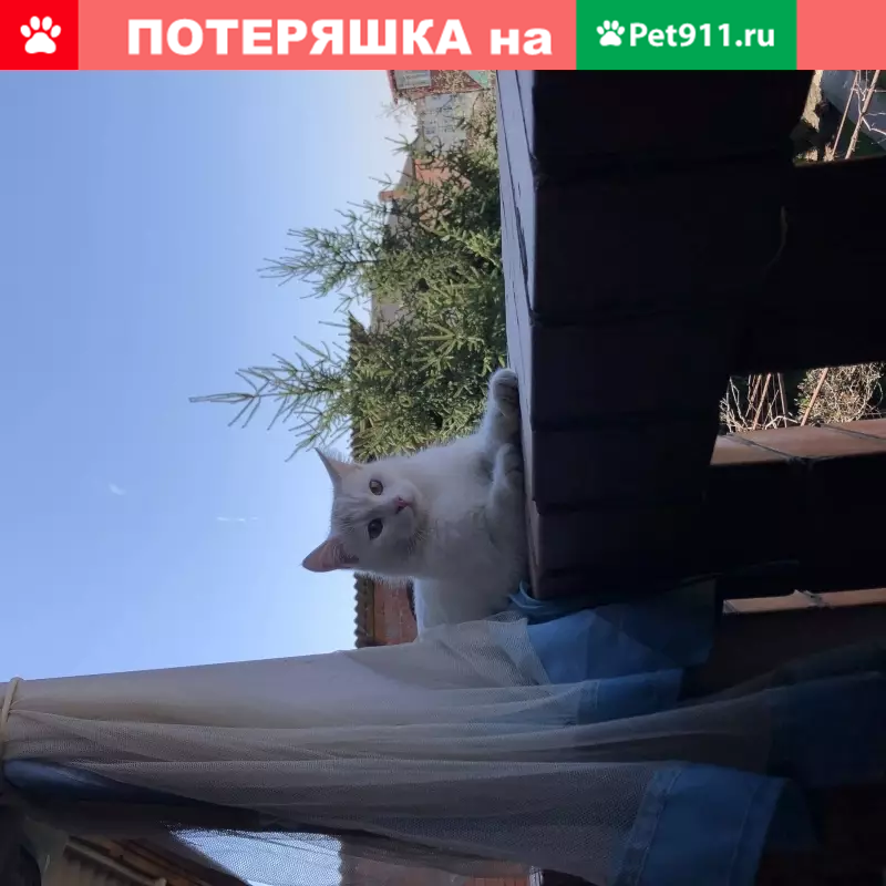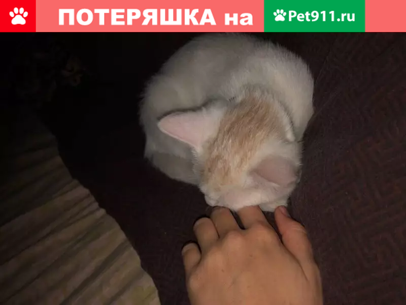 Пропал кот Окрас белый с рыжим пятном на голове, длинный хвост, добрый, отзывается на Чик или Пусик, кастрированный.