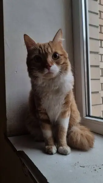 Кошечка, рыжий окрас с белым "воротничком", желто-зеленые глазки, на кошке есть красно-белый ошейник.