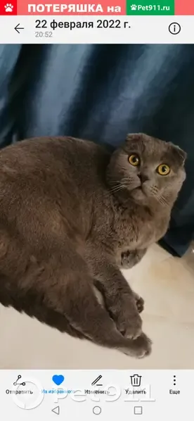 Окрас - серый дымчатый Возраст 2 года Вислоухий Глаза - желтые, большие Спокойный, пугливый, никогда не выходил на улицу - только частный дом и огороженный двор. Откликается на кличку Мани. Пропал вечером после 21-00 29 марта в районе пересечения улиц Комсомольская и Бершанская вышел во двор и не пришел.