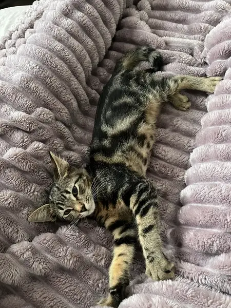 Девочка, тощее телосложение, длиннющий тонкий хвостик, полосатая, спинка черная . Круглая голова, светлый подбородок. Если присмотреться верхняя губа немного напоминает заячью. Ласковая, разговорчивая, любит играть с фантиками, бумажечками и обоями… Голос тонкий, писклявый.