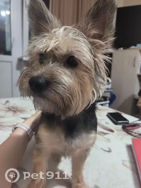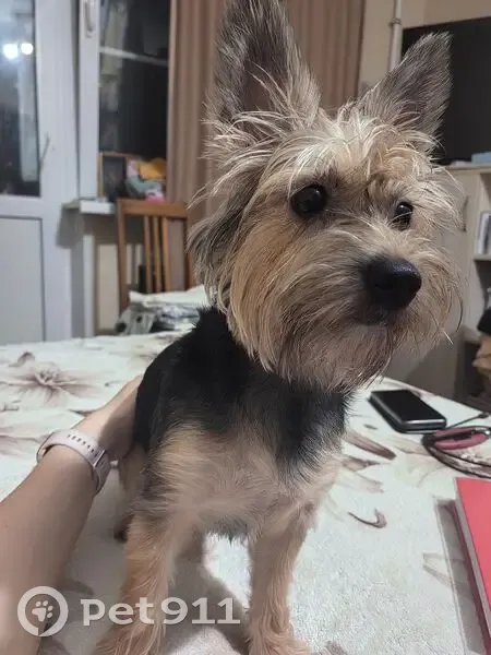 Окрас как у Йорка, только крупнее размер, больше 5 кг, на груди между передними лапами белая полоса, хвостик серо-бежевый. Ласковая, но пуглива, когда пугается гавкает. Гавкает на больших собак. Очень боится фейерверков, из-за них и убежала.