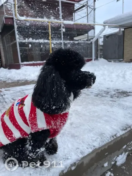 Черный той пудель оставили у друга не передержку выбежала из подъезда и побежала она очень сильно боится белая бородка