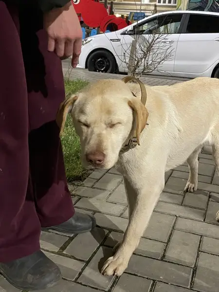 Порода лабрадор-ретривер, цвет золотистый.