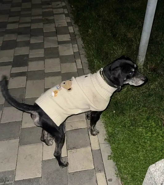 Добрый пёс, примерно 2,3 года, цвет чёрный мрамор, на груди белый галстук, (белое пятно). Очень любит детей. Немного подергивается правая лопатка, после болезни осталось. Любая информация важна.