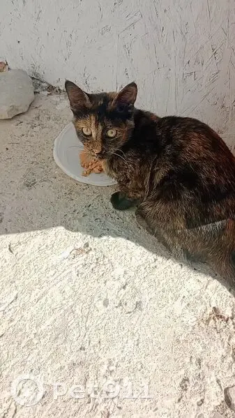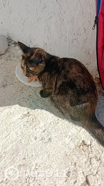Молодая кошечка-подросток (возраст не умею определять, думаю до года), окрас черепаховый глазки чистые, не упитанная, но и не худая. До этого в этом районе не видела, хотя нахожусь в Голубой бухте с 06 августа. Местные продавцы в палатках сказали, что она появилась 25.08.2025,до этого они тоже её не видели.