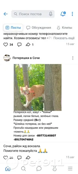 Объединено с объявлением rl1080710. Причина-дублирование информации. Описание дублирующего объявления: Рыженький с белым. Глазки зелёные. Отзывается на имя Кейни. Возрас 5 лет. Котик умный, но пугливый. Пожалуйста может кто видил, или увидит позвонить по телефону 89174550428.