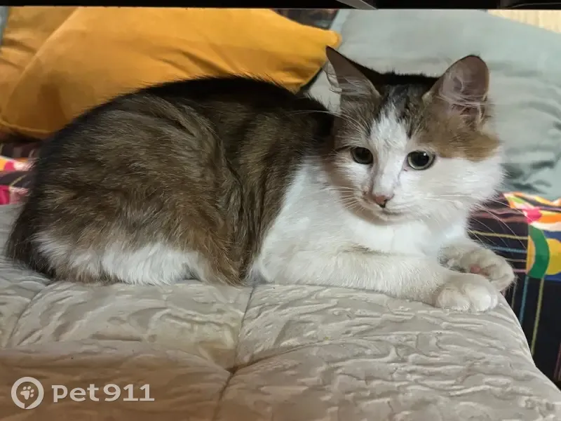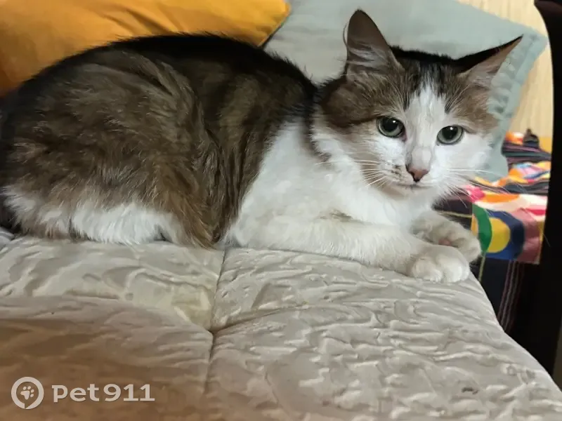 Найдена ласковая кошечка, по виду домашняя, очень спокойная, видимо потерялась. От левого глаза отходит стрелка, зеленогоазая. Хозяева, найдитесь!!!