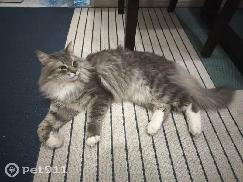 Серый окрас, довольно длинная шерсть. Кот взрослый, кастрирован, к лотку приучен, ручной. Найден в подъезде, в квартиру зашел без проблем. Корм ест сухой. Сам по себе ручной, не агрессивный. Бельмо на левом глазу.