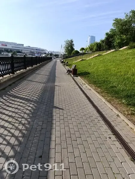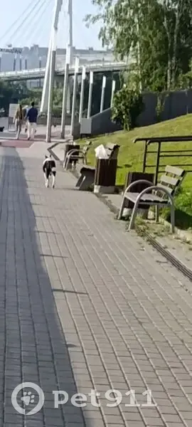 Собака средних размеров, окрас черно белый, есть медальон видимо с телефоном. Но, к сожалению, она пробежала мимо меня, а я была с двумя собаками и успела сфотографировать только уже убегающую. Неделю назад она бежала чуть выше набережной, вдоль домов. Собака уже сильно похудевшая.