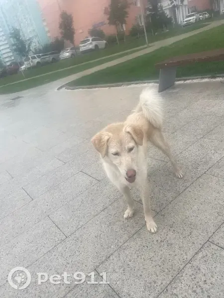 Кобель, молодой, видно что щенок. Бегает по набережной Павшинской поймы, Красногорск. Активный, подбегает к собакам, что бы поиграть и побегать, к людям подходит, но не дается посмотреть ошейник. На ошейнике карабин от поводка, видимо сорвался.