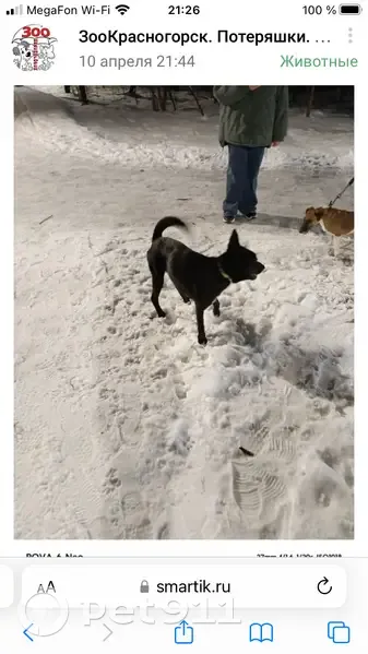 Окрас чёрный, в районе груди белое пятно, на шее белая шерсть, с ошейником. Бегает в экопарке Губайлово. После размещения объявления пропал. 28.03.2025г. Снова появился. Бегает в районе ЖК «Бруски». 15.04.2025г. Бегает в стрессе в том же районе. Похудел. Близко не подходит.