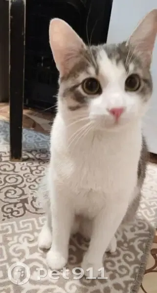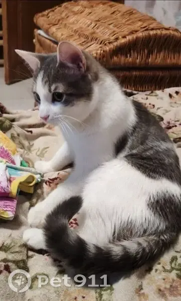 • Кличка: Фантик Не часто отзывается на имя, придерживаясь традиционного: кыс-кыс-кыс • Пол: Мужской. Под хвостом и на самом хвосте снизу до сих пор присутствуют последствия кастрации, в виде пятен зелёнки. • Окрас: Белый с серыми пятнами. На голове серая "шапочка", захватывающая уши и часть мордочки, белая полоса посередине. На теле большое серое пятно. (Более четкое описание можно подчеркнуть из приложенных фото.) • Шерсть: Короткая • Особые приметы: отсутствие ошейника. На кончике носа, шёрстка немного отличается от общей массы, направлением и является более редкой