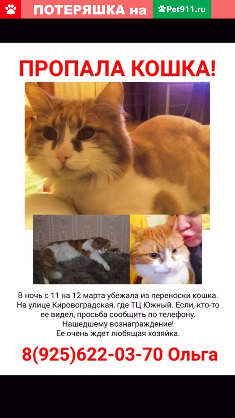 Потерянные животные Москва, фото: Пропала рыжая кошка в Москве